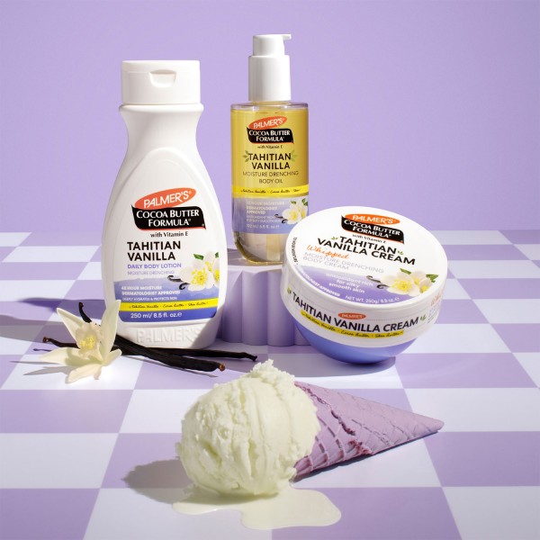 Tahitian Vanilla, Cocoa Butter, Shea Butter, Almond Oil.